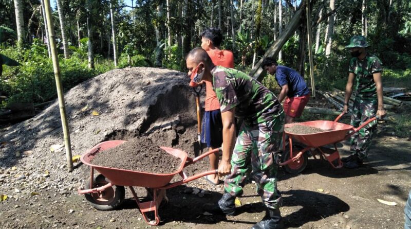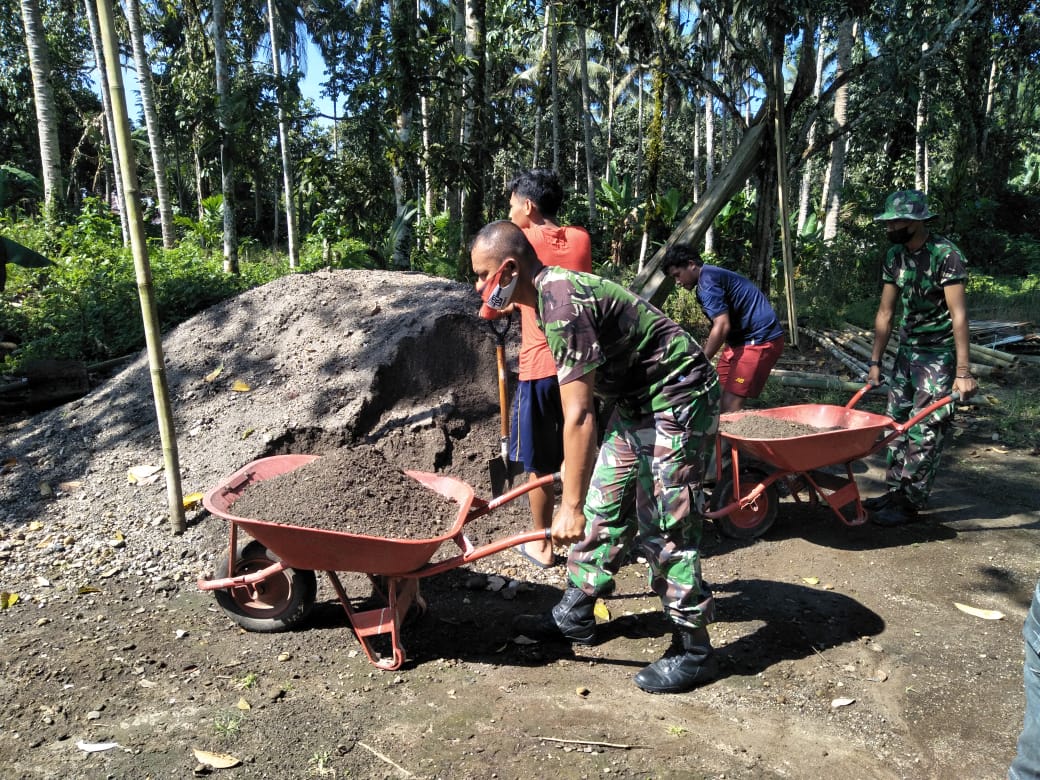 Dalam kegiatan tersebut tanpa ragu Babinsa terjun langsung membantu mencampur semen dan pembuatan pondasi rumah keluarga Nikson Flori.