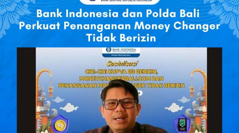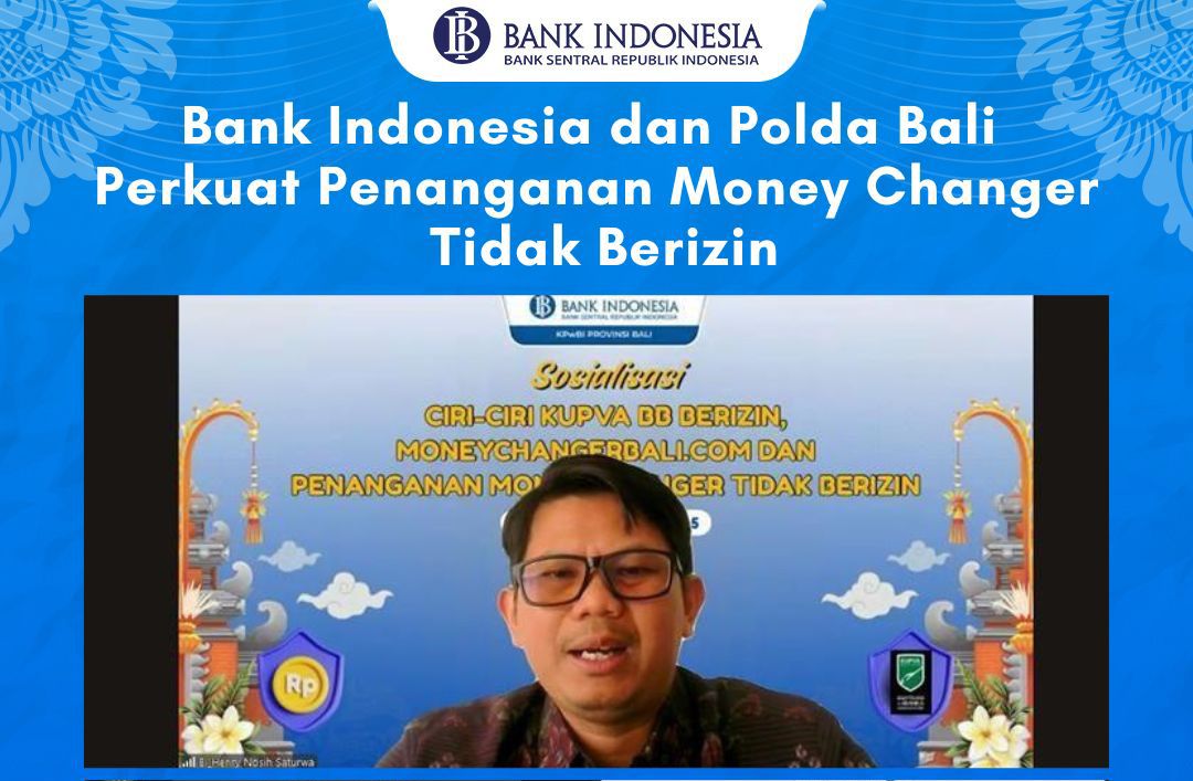 (Baliekbis.com), Kantor Perwakilan Bank Indonesia Provinsi Bali bersama dengan Kepolisian Daerah Bali bersinergi untuk meningkatkan pemahaman masyarakat mengenai Kegiatan Usaha Penukaran Valuta Asing Bukan Bank (KUPVA BB) atau dikenal dengan Money Changer. Upaya ini diwujudkan melalui pelaksanaan sosialisasi secara online kepada lebih dari 200 peserta, yang terdiri dari perwakilan Dinas Pariwisata se-Provinsi Bali, Satpol PP, asosiasi pariwisata (Gabungan Industri Pariwisata Indonesia (GIPI), Bali Hotel Association (BHA), Indonesian Hotel General Manager Association (IHGMA)), Asosiasi Pedagang Valuta Asing (APVA) Bali, serta perwakilan desa adat.