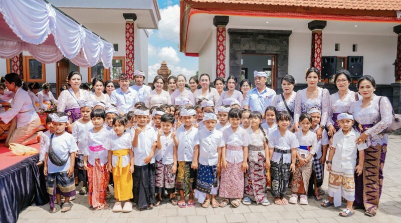(Baliekbis.com), Bunda PAUD Kabupaten Badung Nyonya Rasniathi Adi Arnawa menghadiri Karya Melaspas, Ngenteg Linggih sekaligus meresmikan Gedung baru TK. Kumara Ngurah Rai I yang ditandai dengan pemotongan pita, Kamis (16/4).