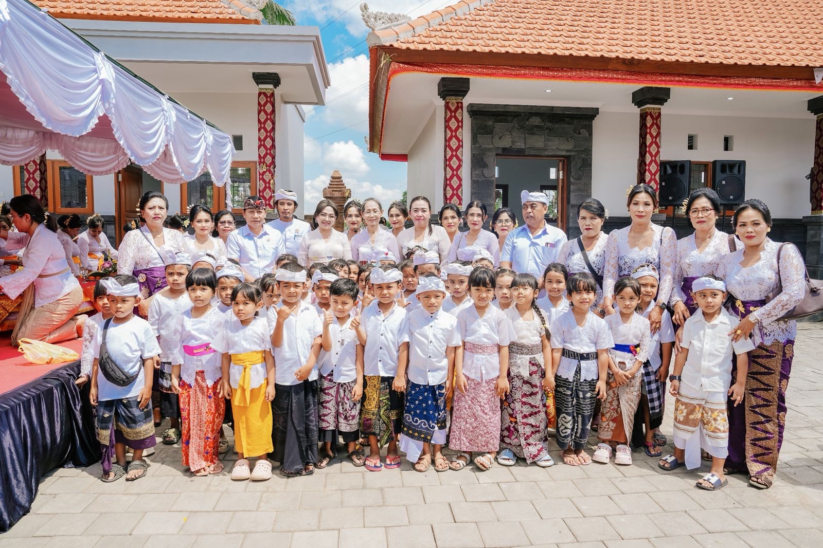 Dalam sambutannya, Nyonya Rasniathi Adi Arnawa menyampaikan rasa syukur dan kebanggaannya dapat hadir sebagai saksi atas penyelesaian pembangunan fasilitas pendidikan ini. Ia menekankan bahwa keberadaan gedung baru ini bukan hanya sekadar bangunan fisik, melainkan wujud nyata komitmen bersama dalam memajukan pendidikan di Kabupaten Badung. “Saya sangat senang dan terhormat dapat hadir untuk menyaksikan prosesi adat serta meresmikan gedung baru ini. Dengan adanya fasilitas yang baru dan lebih baik ini, saya percaya bahwa proses belajar mengajar akan menjadi jauh lebih nyaman, aman, dan menyenangkan bagi anak-anak didik kita,” ujar Bunda PAUD Badung.