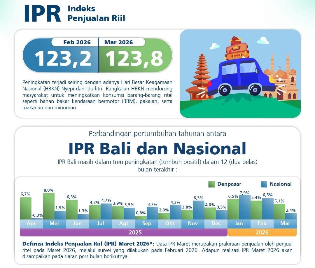 (Baliekbis.com), Optimisme penjualan eceran di Provinsi Bali pada Maret 2026 terus menunjukkan pertumbuhan secara tahunan. Hal ini tercermin dari Indeks Penjualan Riil (IPR) Bali yang mencapai 123,8, atau tumbuh 5,1% (yoy), dan tetap berada pada level optimistis (>100). Secara bulanan, IPR Bali juga meningkat sebesar 0,5% (mtm), didorong oleh momentum Hari Besar Keagamaan Nasional (HBKN) seperti Nyepi dan Idulfitri.