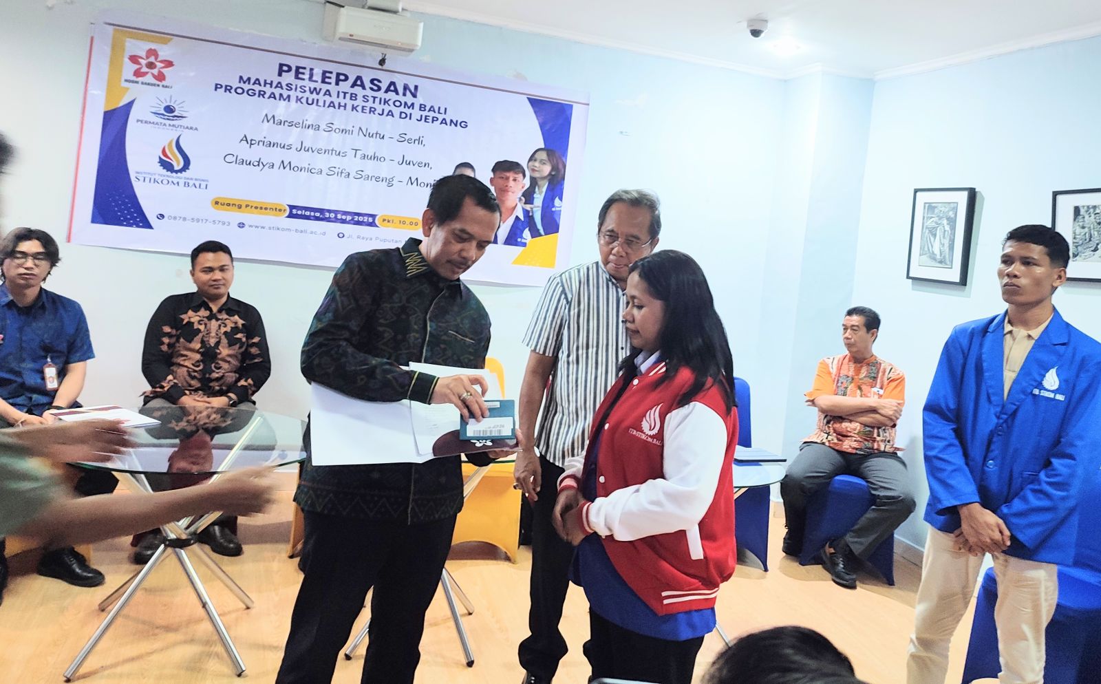 Pelepasan mahasiswa yang akan berangkat ke Jepang secara simbolis ditandai dengan pemakaian jaket, penyerahan paspor dan tiket oleh Rektor Dadang Hermawan didampingi Ketua Yayasan IB Dharmadiaksa kepada Serli.