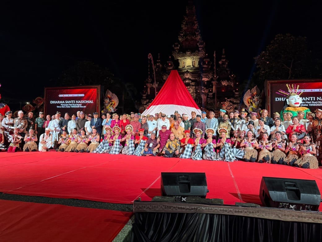 (Baliekbis.com), Perayaan Dharma Santi Nasional dalam rangka Hari Raya Suci Nyepi Tahun Baru Saka 1948/2026 digelar di Ardha Candra, Taman Werdhi Budaya, Denpasar, Bali, pada Selasa (17/6/2025) petang. Kegiatan diawali dengan Puja Trisandya yang dipimpin Ida Pandita Mpu Jaya Santika Wira Yoga, diikuti seluruh umat dan undangan yang hadir dengan penuh khidmat. Beragam acara turut menghibur undangan, mulai dari bondres, gita puja, musik kontemporer, aneka tarian, hingga puncaknya berupa fragmen tari bertajuk Nusantara Manunggal garapan SMK Negeri 3 Gianyar.