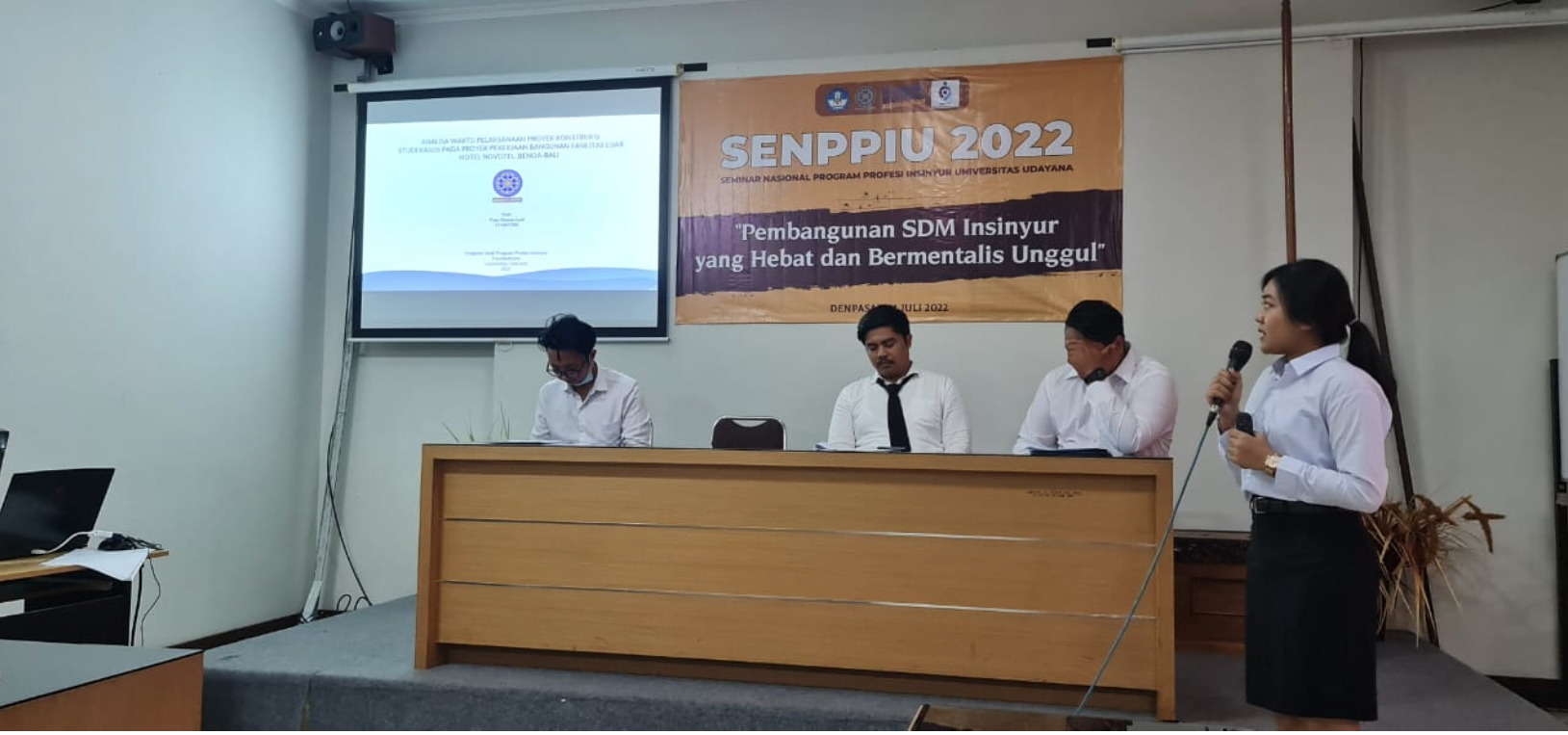 Salah satu pemakalah Putu Kirana Astri mempresentasikan tentang “Analisa Waktu Pelaksanaan Proyek Konstruksi Studi Kasus pada Proyek Pekerjaan Fasilitas Luar Hotel Novotel, Benoa-Bali.” Dalam presentasinya ia menjelaskan dalam pelaksanaan suatu proyek konstruksi, terdapat rincian waktu pelaksanaan proyek dan pekerjaan yang harus dikerjakan selama periode konstruksi berlangsung.